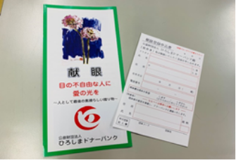 (公財)ひろしまドナーバンクまで、電話、FAX、またはE-mailでご連絡ください。献眼申込書・パンフレットを送付致しますので、必要事項をご記入の上、投函ください。※広島県在住の方に限ります(献眼登録はお住まいの各アイバンクとなっております)
